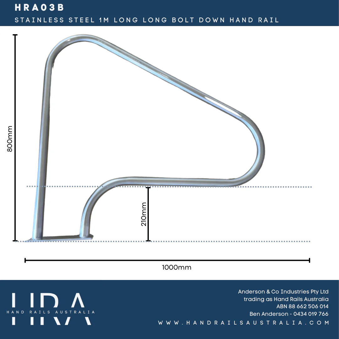 Enhance your poolâs safety and accessibility with our 1m Long Bolt-Down Swimming Pool Handrail, proudly designed and manufactured in Australia. This single grab rail is ideal for providing stable support when entering or exiting your pool via stairs or ledgesâperfect for both residential and commercial settings.